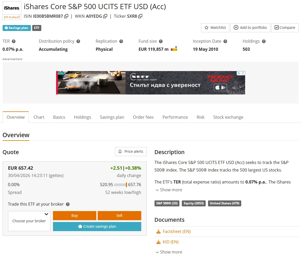 И тук логиката е същата - акумулиращ ETF, физическо пълно възпроизвеждане и годишна такса от 0,03%. На пръв поглед това изглежда почти същото като предишния пример и в голяма степен наистина е така. Разликите отново са по-скоро в мащаба, историята и някои по-фини особености, отколкото в самата основна експозиция.