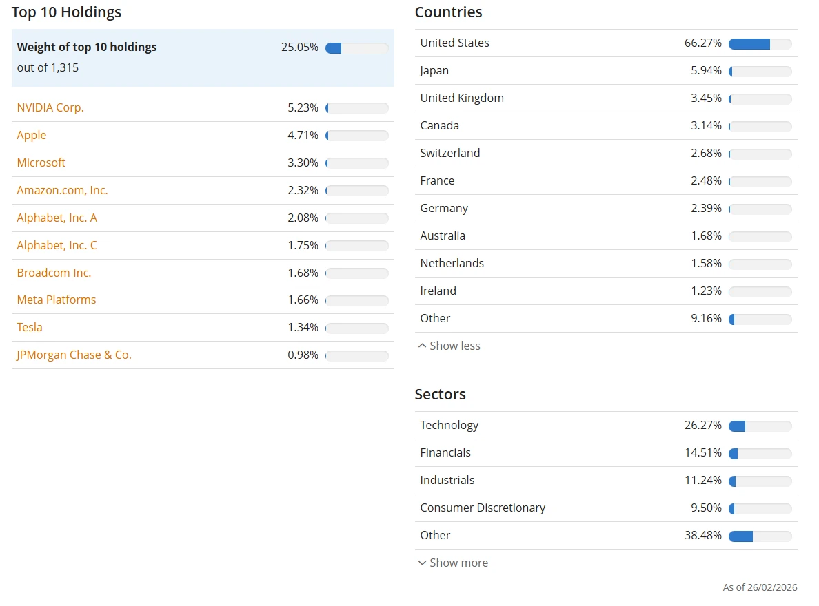 Нека видим един прост пример. На теория глобален ETF звучи като широко разпределение по целия свят. На практика обаче често виждаме сериозна концентрация в САЩ и в едни и същи големи компании.