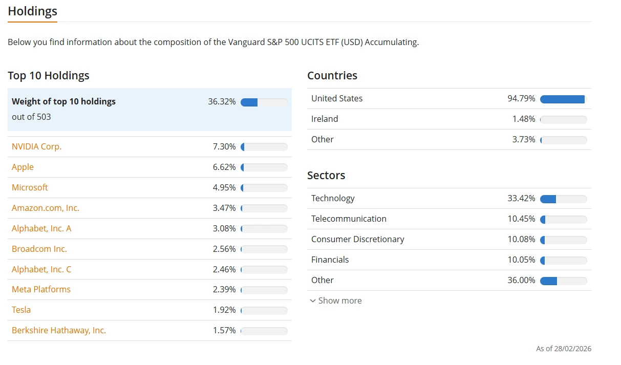 При S&P 500 (Vanguard S&P 500 UCITS ETF (USD) Accumulating) концентрацията е още по-ясна - почти 95% експозиция към САЩ и над 36% в топ 10 компании. Това е добър ориентир колко близо могат да бъдат два на пръв поглед различни инструмента.